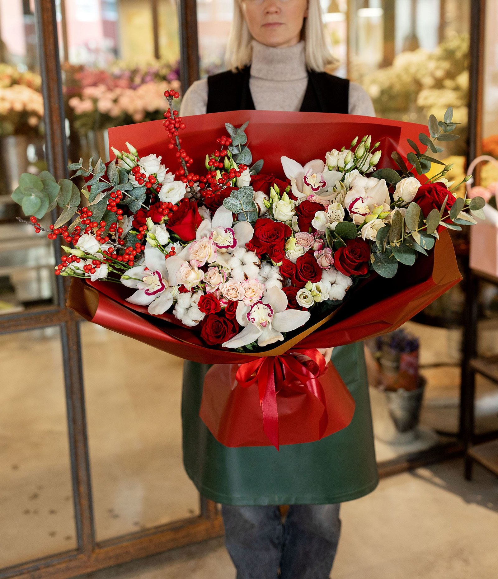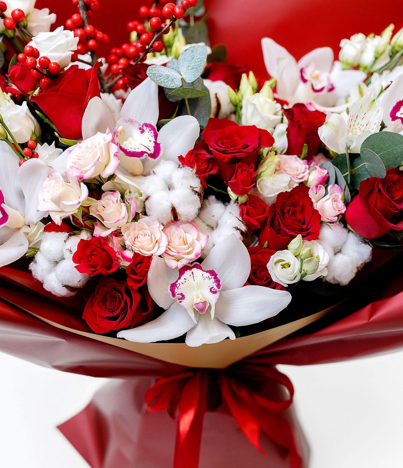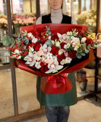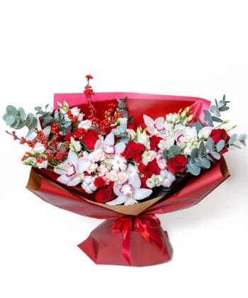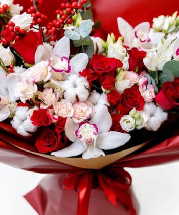 Bouquet Designed by a master florist for a special occasion. The bouquet features red roses, fragrant cymbidium blossoms, and other gorgeous seasonal flowers. The friendship of the flowers creates luxury and exclusivity for a special occasion. The Special Occasion Bouquet is the perfect way to congratulate, surprise, honour. The flowers may vary from season to season, but the colour scheme will always remain the same.