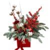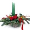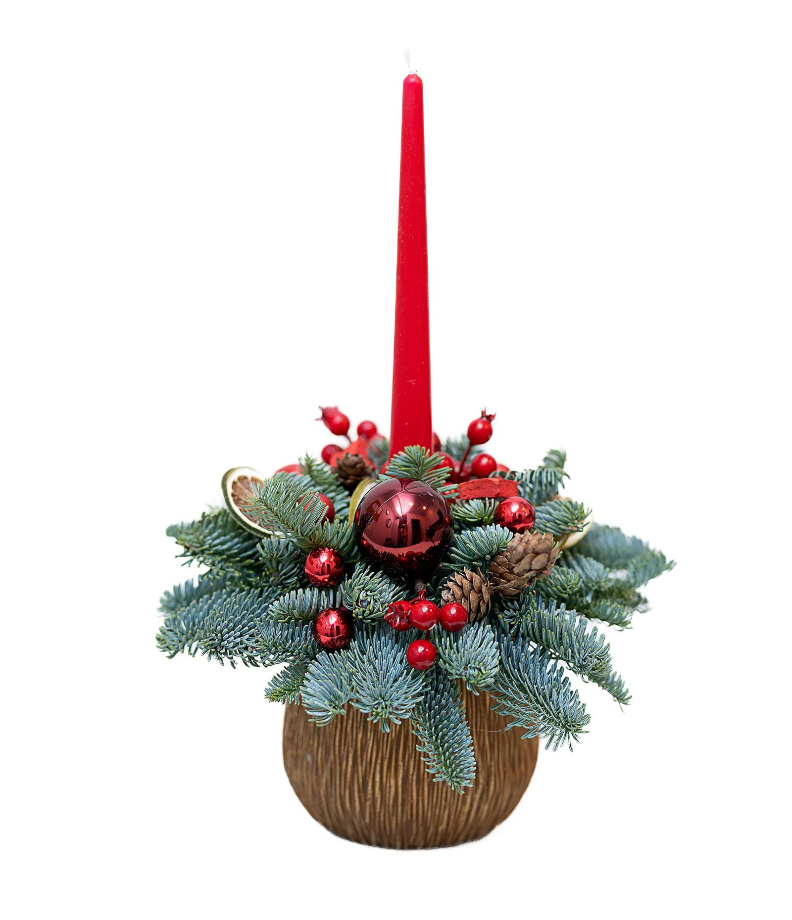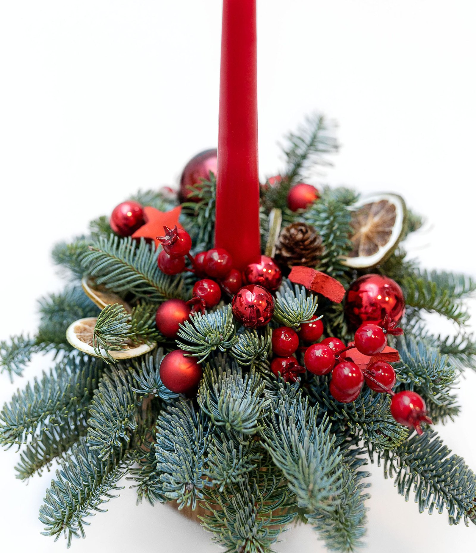 Праздничная композиция с красной свечой подойдет для украшения как праздничного стола, так и общего пространства Вашего дома или работы. Композиция составлена из душистых еловых веток, сушеных апельсинов и других элементов праздничного декора.