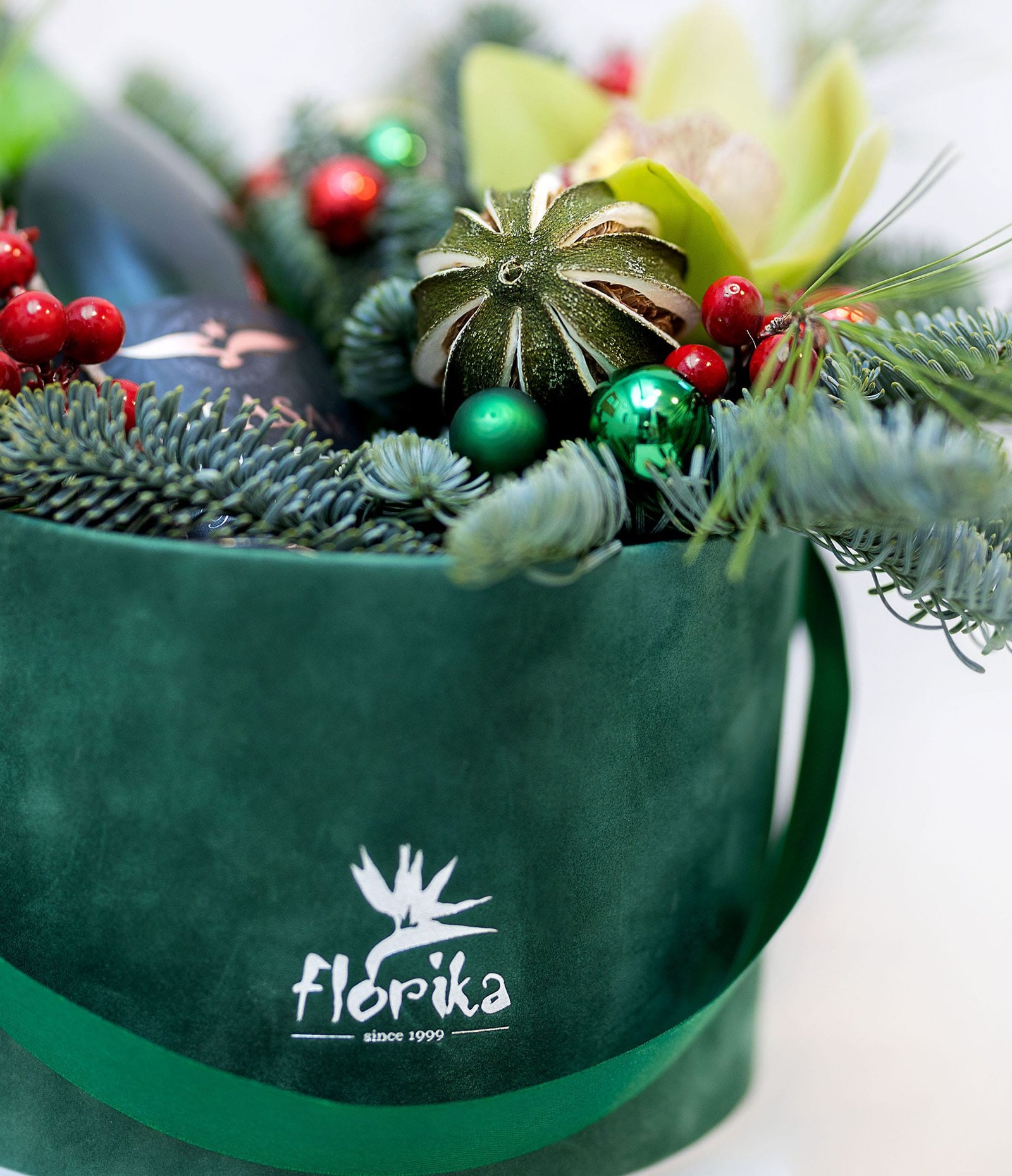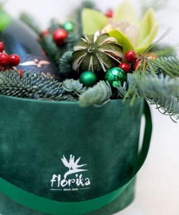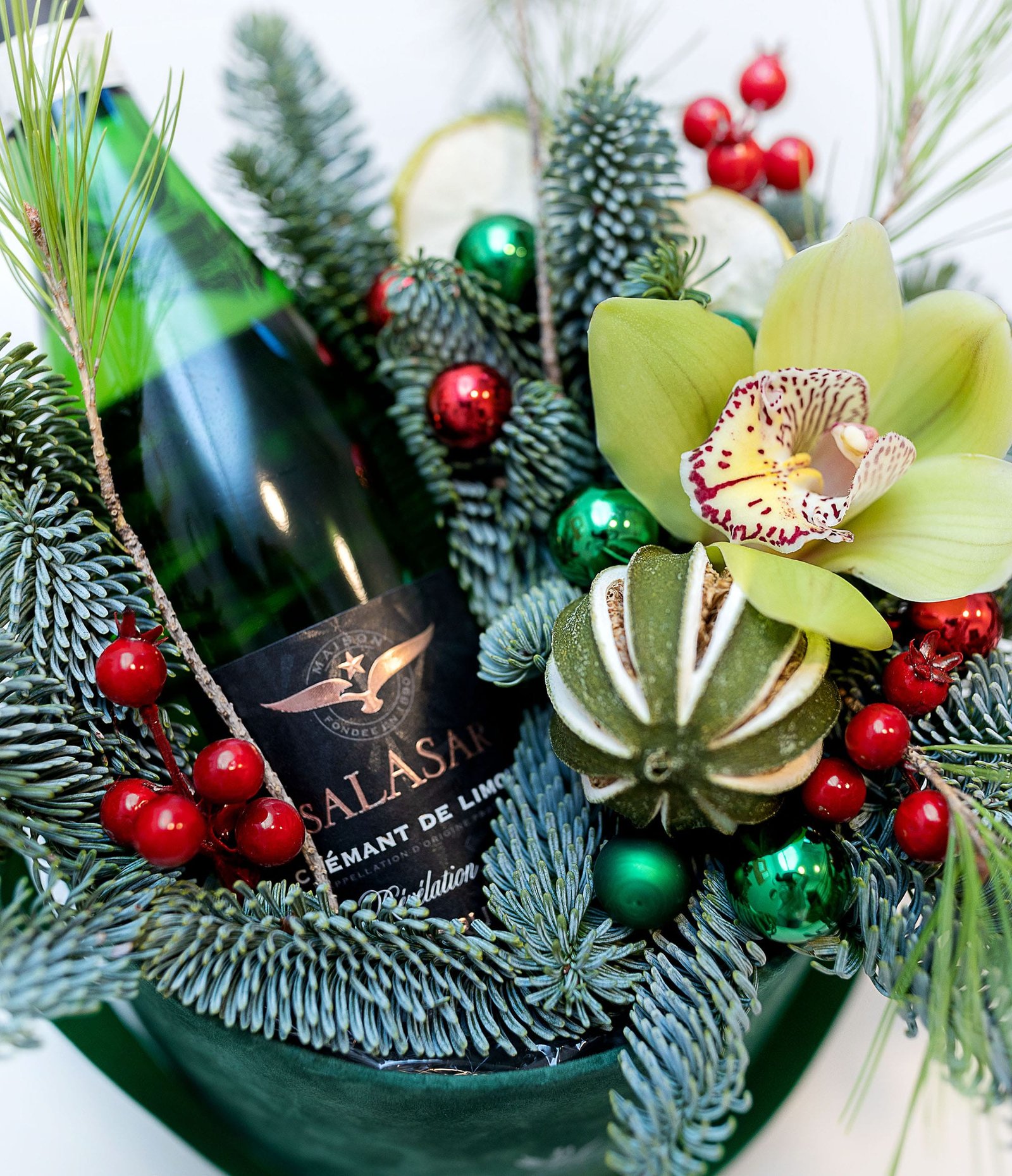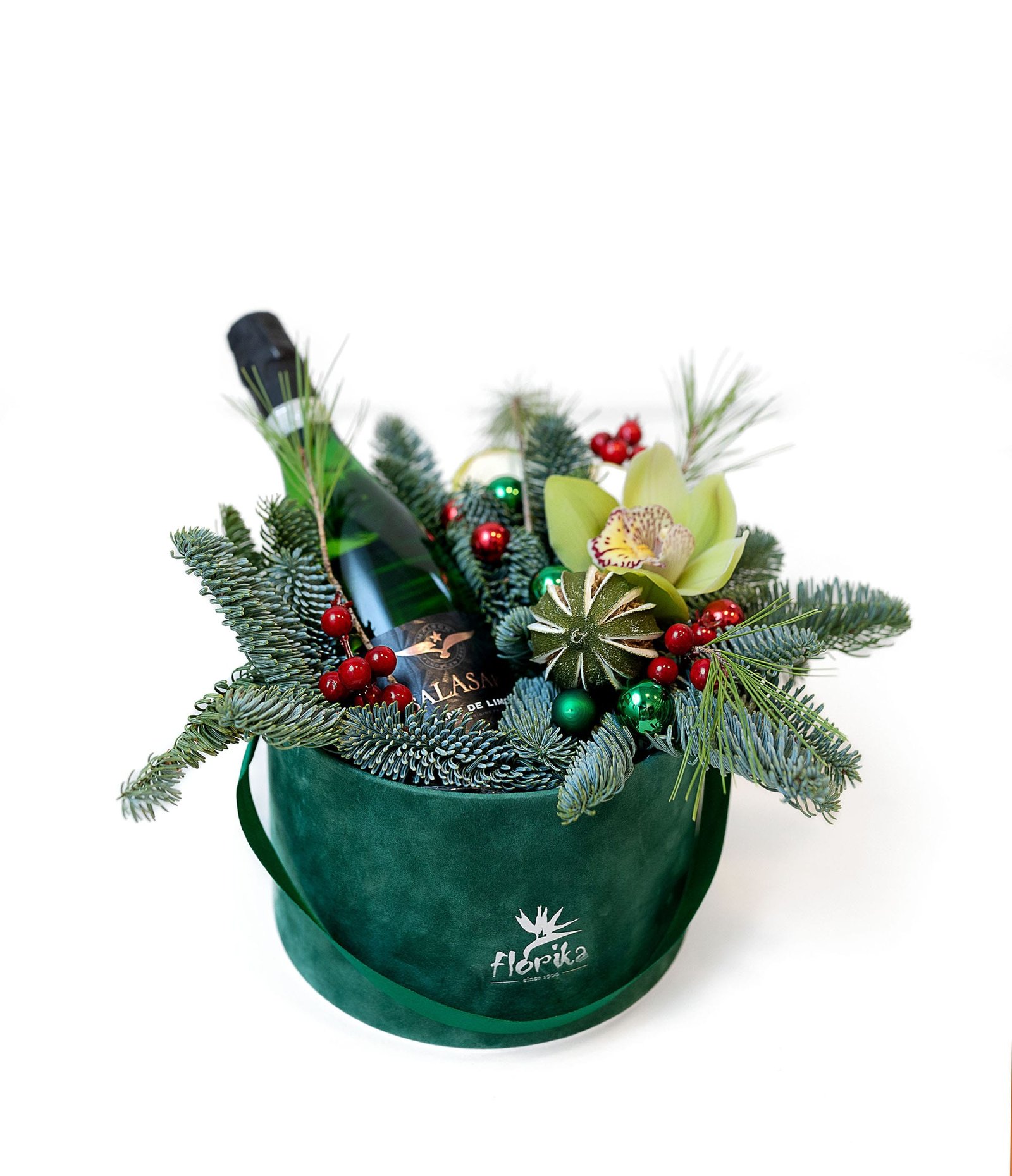 В зеленой велюровой коробке находится восхитительное игристое вино SALASAR Cremant de Limoux. Ароматные еловые ветки, кольцо цимбидиума и другой рождественский декор создают приподнятое праздничное настроение. Это идеальный праздничный подарок для любимого человека, коллеги или близкого человека.