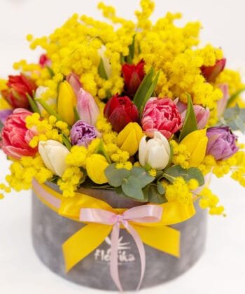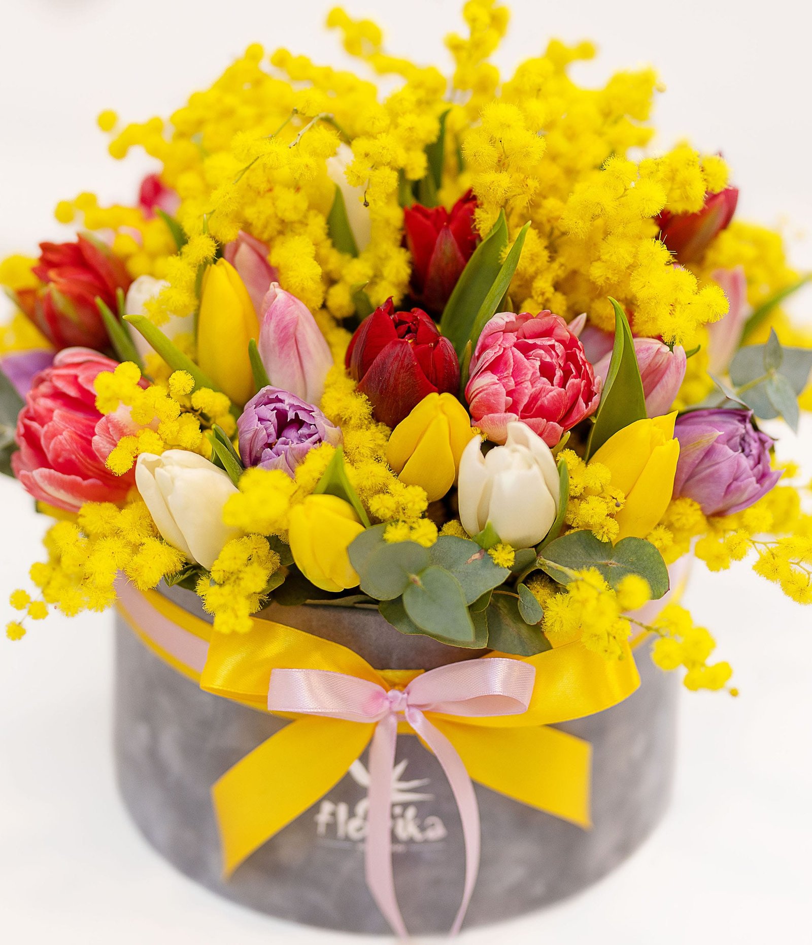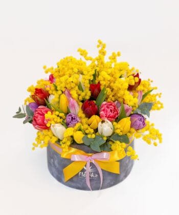 Цветочная коробка «Весна» — это велюровая коробка, наполненная самыми красивыми весенними цветами — мимозой и тюльпанами. Цветочная коробка Spring — идеальный способ поздравить любимого человека с наступлением весны.